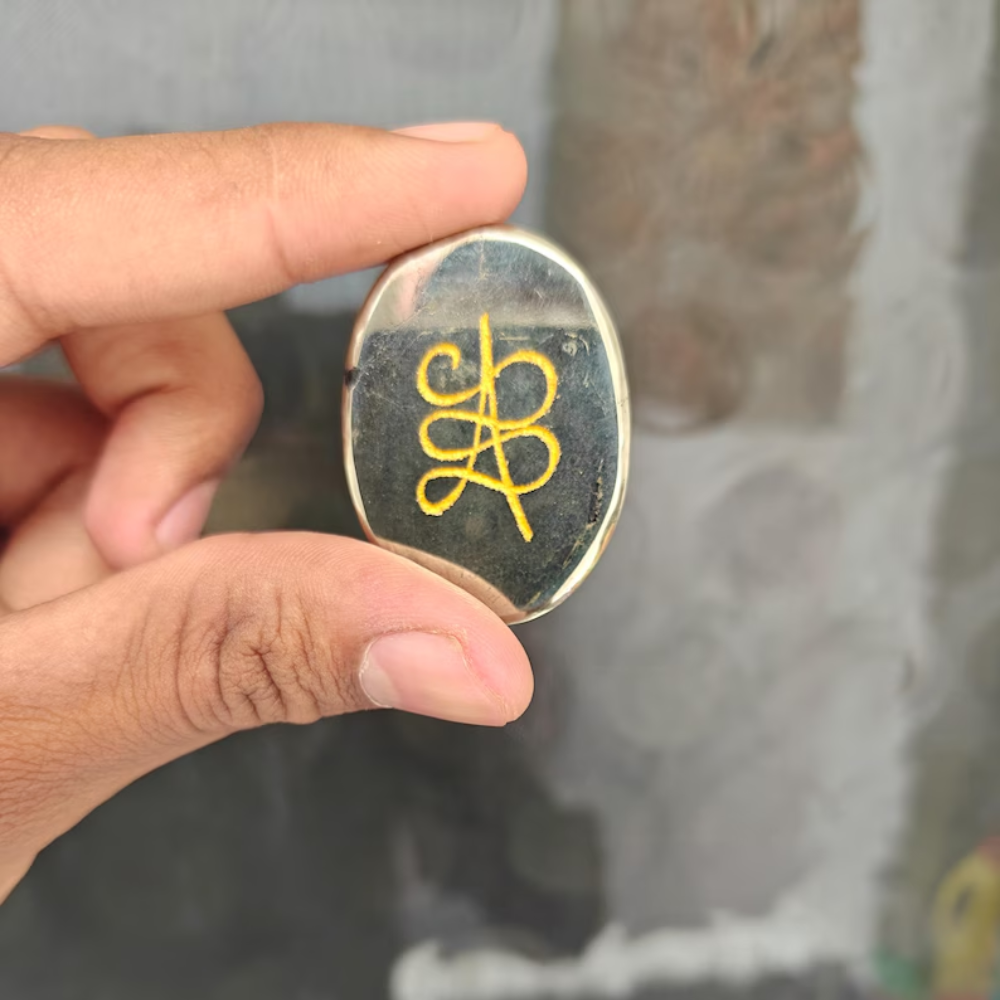 Keeping a Pyrite Zibu Coin in your wallet, cash box, office desk, locker, or pooja space helps attract wealth, improve financial stability, and protect against negative influences and energy drain. The coin shape represents continuity and flow of abundance, while Zibu symbols act as energy activators for manifestation and protection.